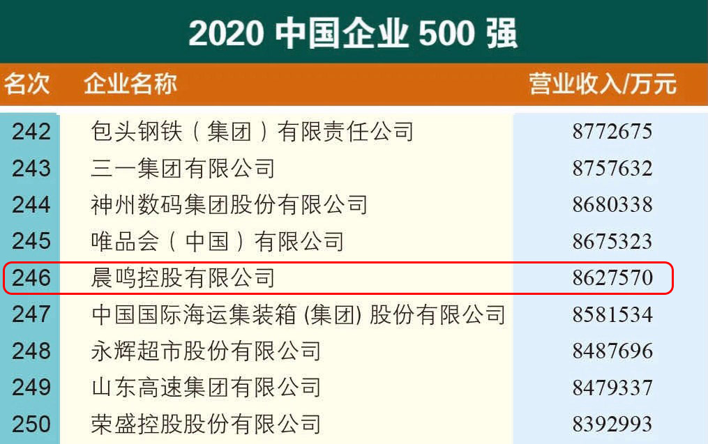 9月27-28日,由中國企業(yè)聯(lián)合會、中國企業(yè)家協(xié)會主辦的第19屆“2020中國500強企業(yè)高峰論壇”在河南鄭州召開,備受矚目的“2020中國企業(yè)500強”榜單正式發(fā)布,晨鳴控股排名第246位,位居行業(yè)榜首。在同期發(fā)布的“2020中國制造業(yè)企業(yè)500強”榜單中,晨鳴控股位列107位。